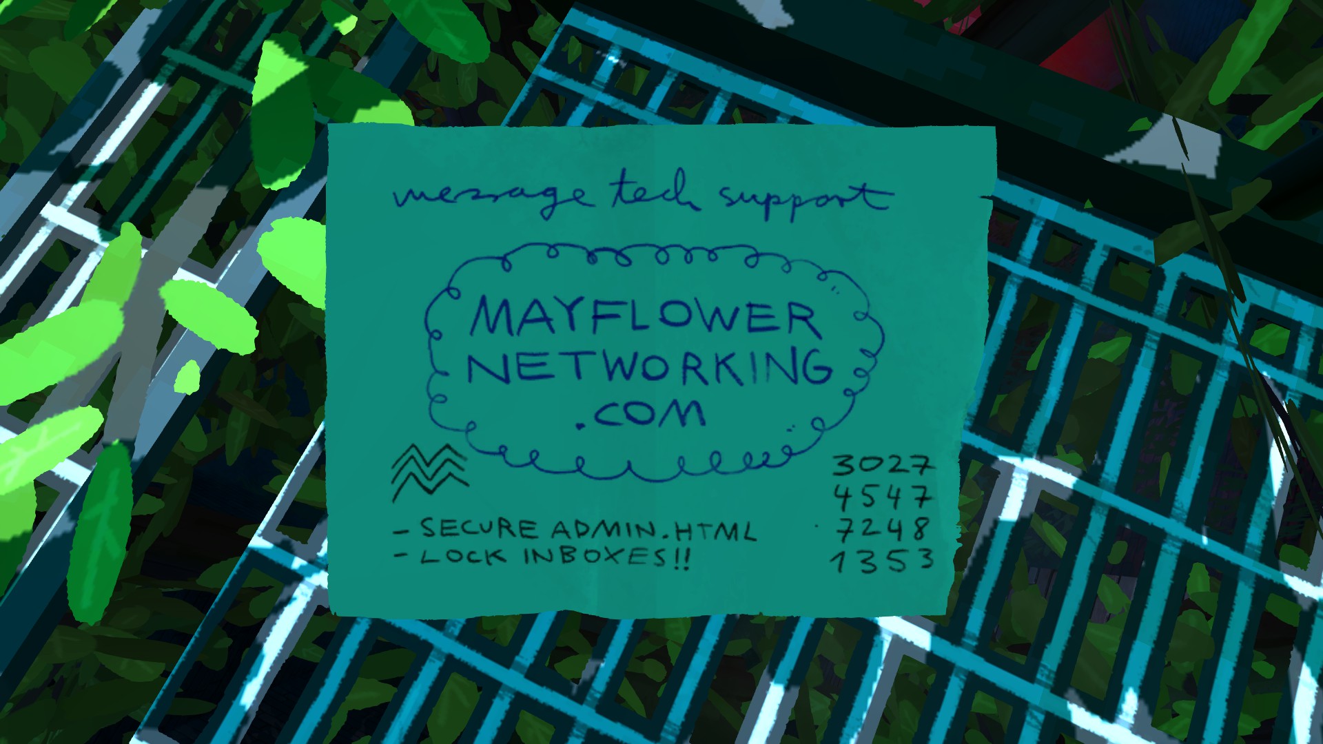 게임 클라이막스 즈음에서, MAYFLOWERNETWORKING.COM 이라고 적혀 있는 문서를 발견할 수 있습니다. 실제로 존재하는 페이지입니다. 여기로 리다이렉트 되죠. 가시면 마치 오류가 나서 깨진 것처럼 보이는 사이트가 있습니다. 눈썰미가 좋으신 분들이라면, mayflower-error를 admin으로 바꾸면 될 것 같다는 생각을 금방 하실 수 있을 겁니다. 물론 이건 흔적일 뿐이고, 들어가시면 여러 이메일들을 읽으실 수 있지만 그것뿐입니다. 저는 그래서 이렇게 생각합니다, 애초에, 이 게임은 거대한 마케팅이었던 거죠. 본인의 스튜디오를 홍보하기 위해서 ARG를 진행하여, 기대감을 증폭시킨 뒤 게임을 공개하는 식으로요. 그렇기 때문에, 어떻게 보면 게임성에 대해서도 이해가 가고는 합니다.