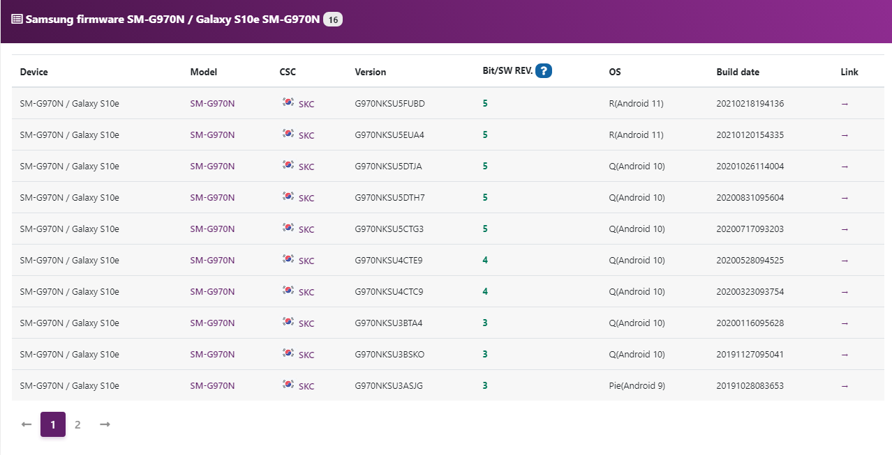 그 뒤, 다운그레이드하려는 펌웨어를 선택하면 됩니다. 주의할 점은, 부트로더 버전이 맞아야 한다는 것입니다. 예를 들어, 가장 최신 펌웨어 버전은 G970NKSU5FUBD 로 확인되는데요, 여기서 U 다음의 숫자, 즉 5가 부트로더 버전입니다. 그 예시로, 오래된 펌웨어들을 보시면 부트로더 버전이 3, 4 인 것을 확인할 수 있습니다.