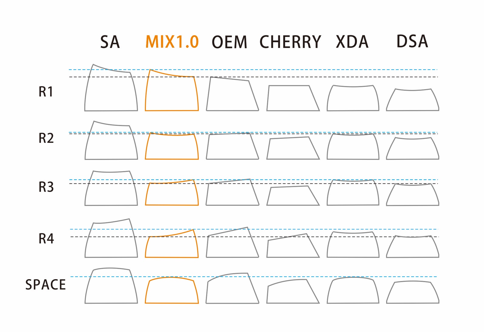 키보드에 관심이 없거나, 주의 깊게 보지 않으면 모르는 사실이지만 키보드의 각 행은 높이가 다릅니다. 정확히는, 키캡의 높이가 다릅니다.