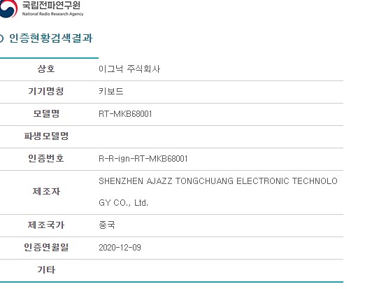 그리고 길게 설명할 것 없이, KC인증 내용을 보면 이 키보드가 AJAZZ 에서 생산되었다는 것을 쉽게 알 수 있습니다. 즉, 일종의 ODM 방식이라고 할 수 있겠죠. 이그닉에서 키보드 생산을 의뢰했고, AJAZZ에서 그에 맞는 키보드를 생산한 것입니다. 물론 그 외의 자세한 사항에 대해서는 알기 어렵습니다. 이그닉이 특정 배열을 요구한 건지, 키캡 색깔은 왜 원본과 달리 회색 1개뿐인지, 축은 왜 갈축과 청축뿐인지...