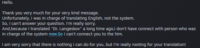 그러나 대답은, 본인은 번역을 담당했을 뿐 기술적인 부분에 대해서는 모른다는 것이었습니다. 저는 여기서 굉장히 절망했고, 잠시 동안은 완전히 한글화 의지를 잃어버리기도 했습니다.
