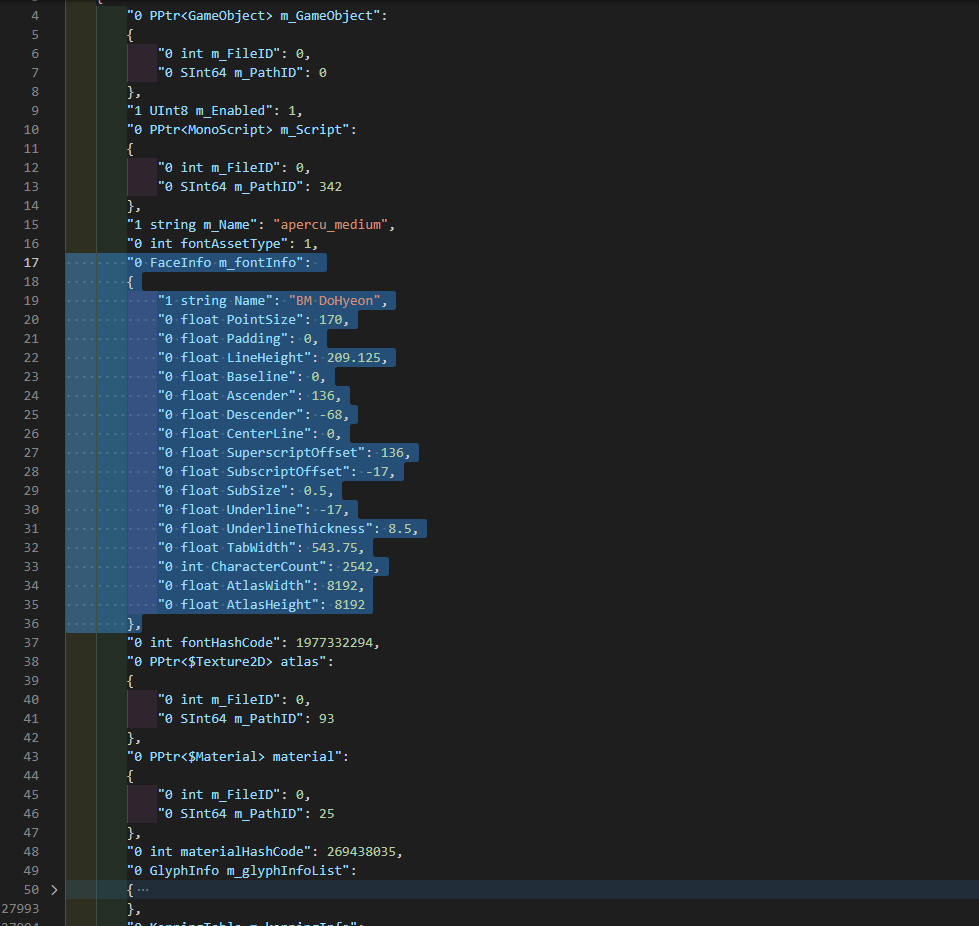 지금 드래그한 부분이 제가 변경한 부분입니다. 우리가 한글패치용으로 만든 게임에서 추출한 JSON 파일에서 저 부분을 복사해서 붙여넣으면 됩니다. 정확히는, 0 FaceInfo m_fontInfo 부분을 대체하는 겁니다.