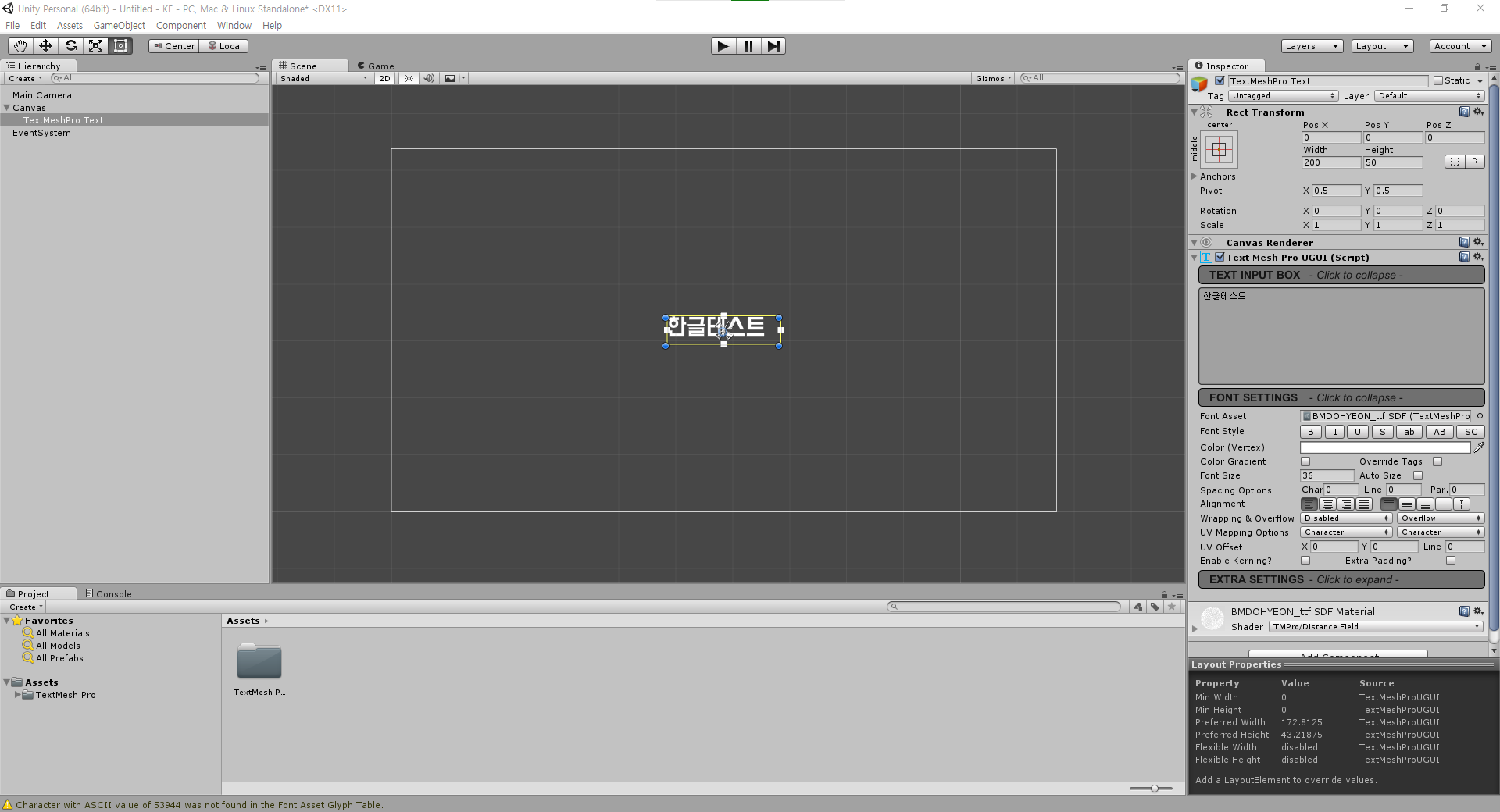 이렇게 됩니다. 괜찮습니다. 당연한 겁니다. 왜냐면, 우리가 만든 한글 폰트를 적용시키기 않았기 때문입니다. 글을 적은 곳 밑에 보면 font asset을 변경할 수 있습니다. 방금 만든 걸로 변경하면...