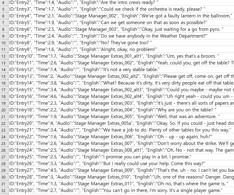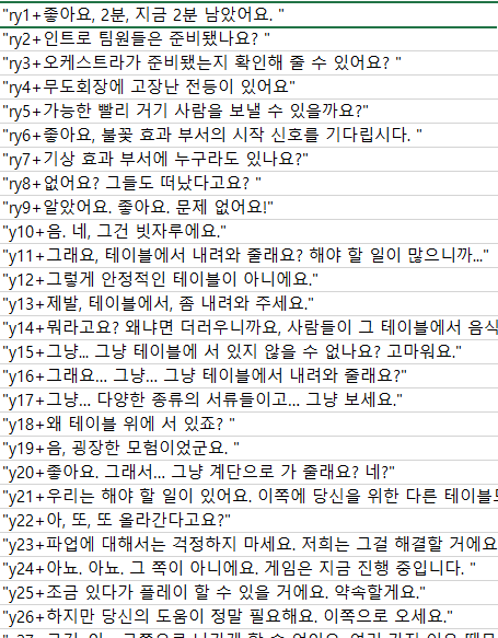 이제 이걸 번역하면 됩니다. 파일을 자세히 보시면 아시겠지만, 같은 내용의 대사가 영어, 독일어, 프랑스어, 스웨덴어 등으로 이어지고 있습니다. 저는 일본어 패치 파일도 뜯어 봤었는데요, 그 결과 그냥 영어 부분만 남기고 나머지는 전부 삭제해도 별 상관 없다는 것을 알 수 있었습니다. 따라서, 다음 할 일은 이 TXT 파일을 엑셀을 통해 보기 쉽게 만드는 것이었습니다. 엑셀의 강력한 여러 기능을 사용하여, 쉽게 해 낼 수 있었습니다. 텍스트 나누기 기능과, left, right 함수를 이용하여 저는 영어 부분만 빼낼 수 있었습니다.