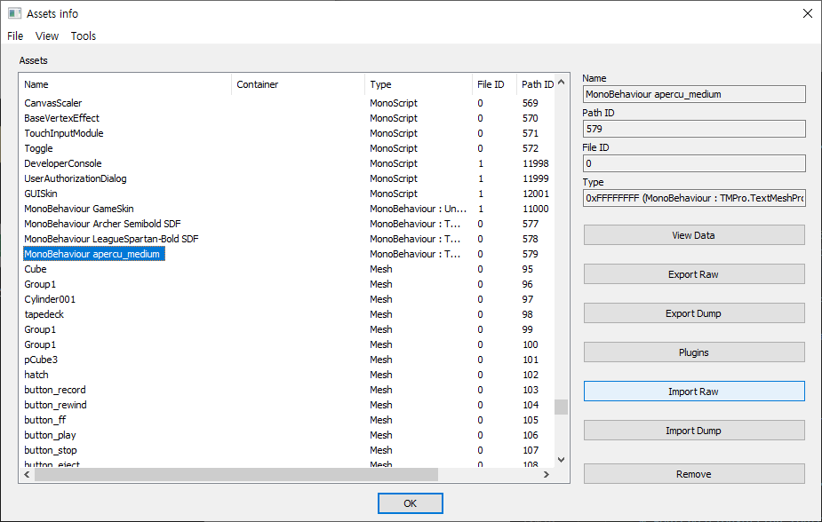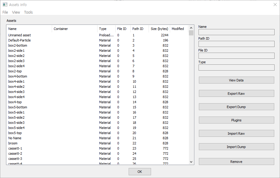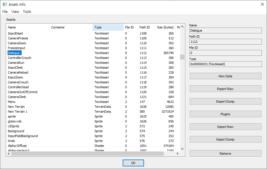 그 뒤 다시 UABE에서 import dump 기능을 이용해서, 방금 수정한 걸로 JSON 파일을 바꿔 줍니다. 다 한 뒤 ok를 누르면, 모든 것이 변경된 sharedassets0 파일을 얻을 수 있습니다.