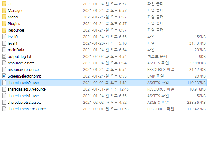 해당 폴더로 이동하셨다면, sharedassets 파일들을 찾습니다.