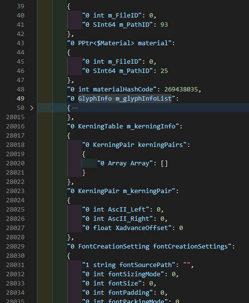 그 뒤에는, GlyphInfo m_glyphInfoList 부분을 복사해서 붙여넣기 하시면 됩니다. 대충 보기에는 내용이 얼마 없는 것처럼 보이지만, 옆을 보시면 실제로는 2만 줄이 넘는 내용입니다. 따라서, 접기 기능을 이용해서 해당 부분을 접은 뒤 복사해서 붙여넣기 하시는 게 좋습니다. 다 수정했으면 저장합니다.